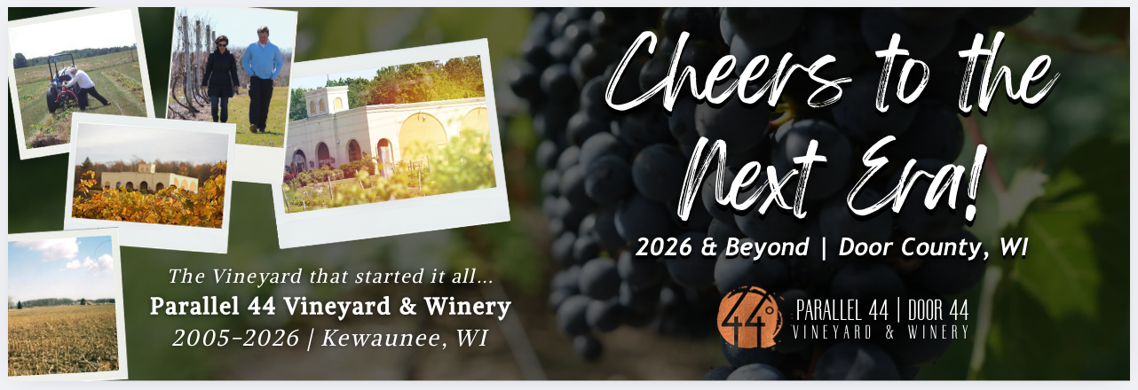 Our tasting room in Kewaunee County will remain open through April 25, after which we will move and consolidate our winery operations, equipment and tanks at our Door County location — where Door 44 & Parallel 44 will consolidate under the name Parallel 44.